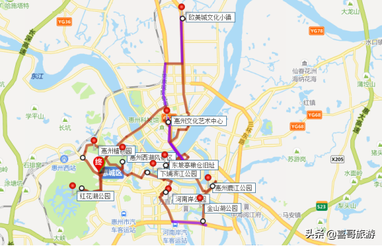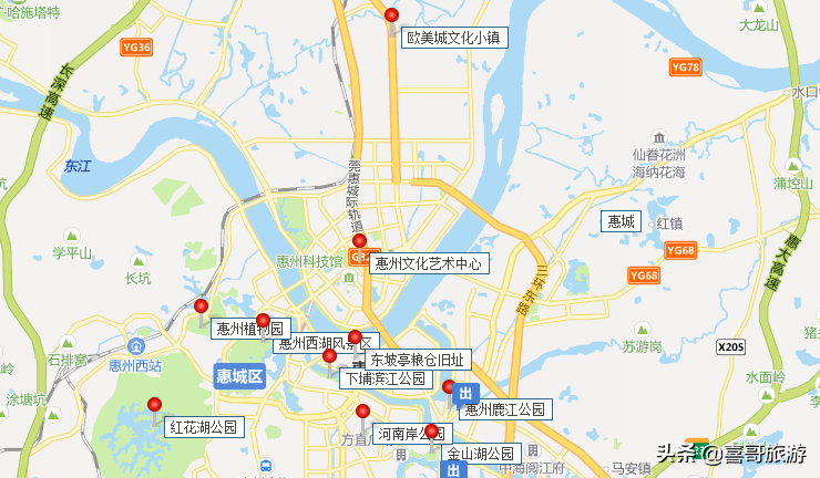 2、惠城区十大景点自驾游行程路线: 惠城区-红花湖公园- 惠州植物园 -惠州西湖风景名胜区-下埔滨江公园-河南岸公园- 金山湖公园 -惠州鹿江公园-东坡亭粮仓旧址-惠州文化艺术中心-欧美城文化小镇-惠城区。