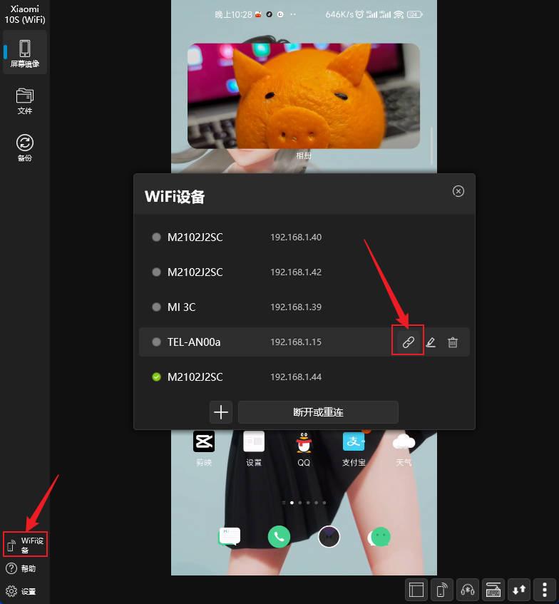 首次无线连接之后,下次无线连接只需要点击wifi设备,选择你的手机并点击连接即可。