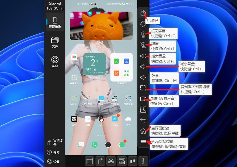 支持全面屏手势操控,鼠标右键是返回,中键回主屏幕,长按右键多任务后台等。软件右侧功能区还可以进行开关手机屏幕,音量加减,截图录屏等常用操作,