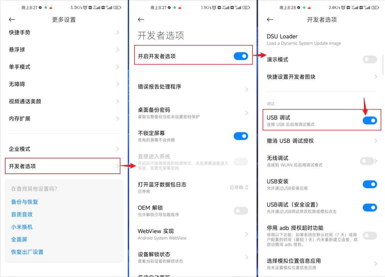 手机端进入设置,点击关于手机,找到系统版本号,快速连续点击5到7次即可开启开发者选项,然后进入开发者选项设置中打开usb调试;