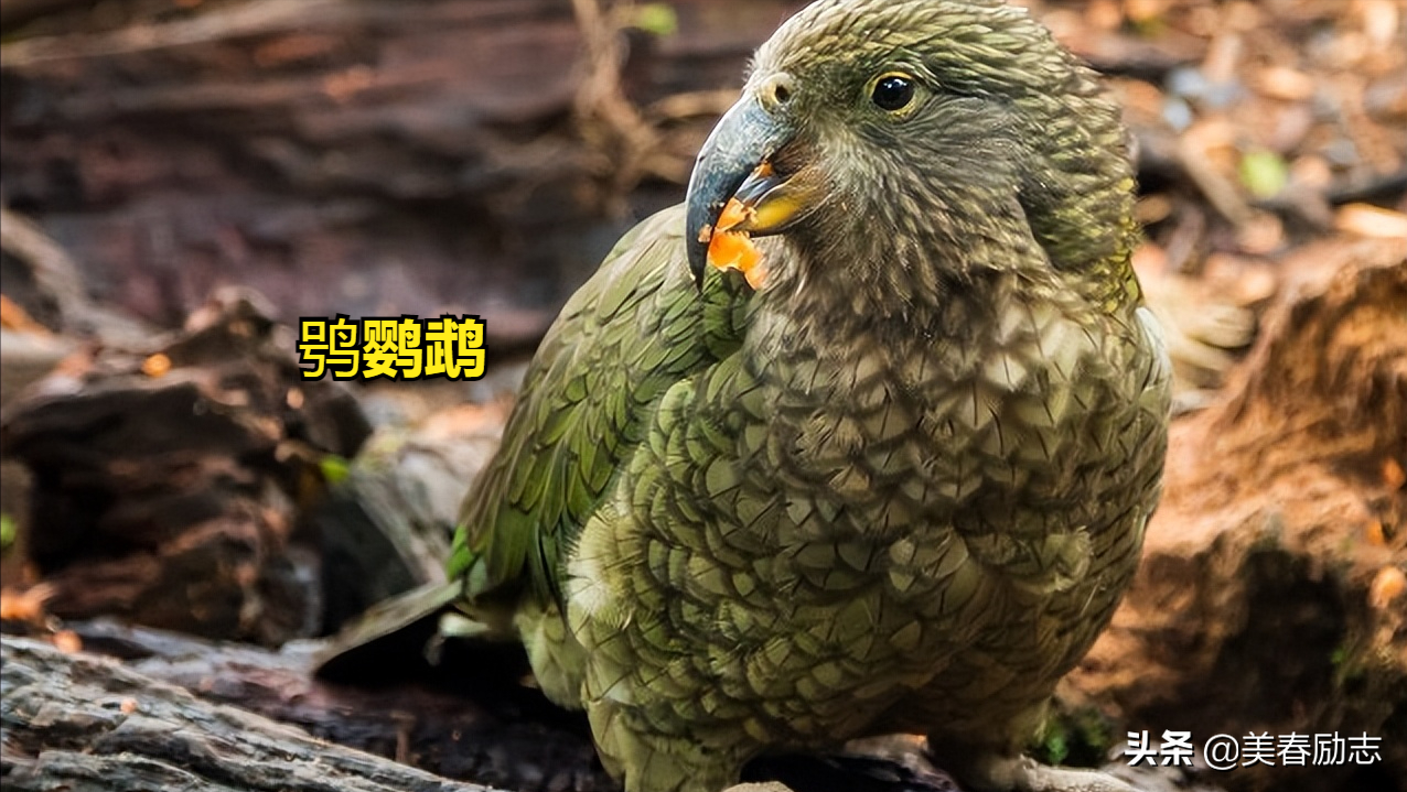 我们再来了解下鸮鹦鹉,它是一种是夜行性的鹦鹉,全身布满黄绿色细点,为新西兰的特有物种。