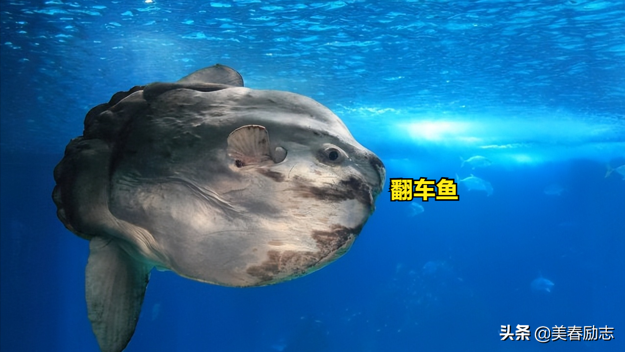 接下来我们说说翻车鱼。翻车鱼是海洋里的大型鱼类,也叫太阳鱼,体长可达3米,重达1400至3500千克。是海洋里最大的硬骨鱼。
