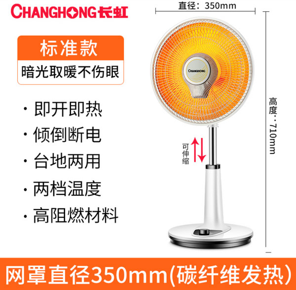 长虹CDN-RT208小太阳取暖器采用热量黄金技术,碳纤维发热管,聚能晶格反射罩,即开即热,低噪暗光,光线柔和不伤眼,功率450/900W二档可调,上下30°广角俯仰可调节,采用碳纤维管发热,无明火并且暗光不刺眼,倾倒自动断电,高温过热保护,全阻燃材料,即使温度再高也不会燃烧。
